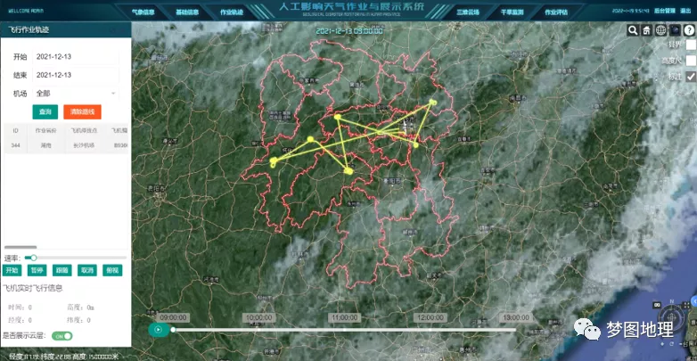 基于气象大数据云平台的人工影响天气精准作业指挥与展示系统基于国内自主研发的GIS平台——DMGIS、气象大数据云平台“天擎”,集成湖南省高分遥感地理信息数据、人影信息数据以及气象监测数据,实现湖南人影作业全域精细化三维地理场景的漫游展示、三维云图的解析与展示、作业效果评估、干旱监测分析以及人影、气象信息的空间可视化分析展示等功能,该系统的建设进一步提升了湖南人影作业指挥与展示能力。